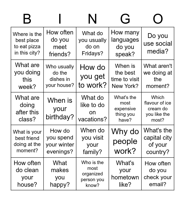 This bingo card has a free space and 24 words: How do you spend your winter evenings?, What makes you happy?, How do you get to work?, How often do clean your house?, Do you use social media?, Where is the best place to eat pizza in this city?, What are you doing this week?, How often do you meet friends?, What's the most expensive thing you have?, When do you visit your family?, When is the best time to visit New York?, What are doing after this class?, Why do people work?, What's the capital city of your country?, Who usually do the dishes in your house?, What's your hometown like?, Which flavour of ice cream do you like the most?, What do you usually do on Fridays?, What aren't we doing at the moment?, When is your birthday?, How often do you check your email?, What is your best friend doing at the moment?, How many languages do you speak? and Who is the most organized person you know?.