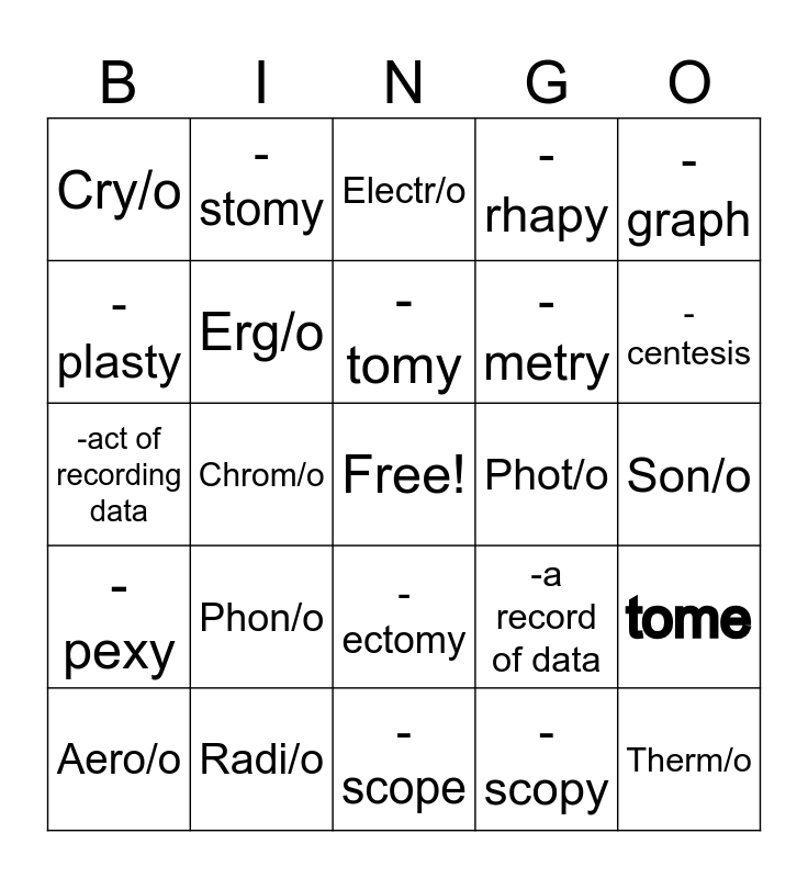 This bingo card has a free space and 29 words: Aero/o, Bar/o, Chrom/o, Chron/o, Cry/o, Electr/o, Erg/o, Phon/o, Phot/o, Radi/o, Son/o, Therm/o, -scope, -scopy, -centesis, -desis, -ectomy, -pexy, -graph, -act of recording data, -a record of data, -meter, -metry, -plasty, -rhapy, -stomy, tome, -tomy and -tripsy.