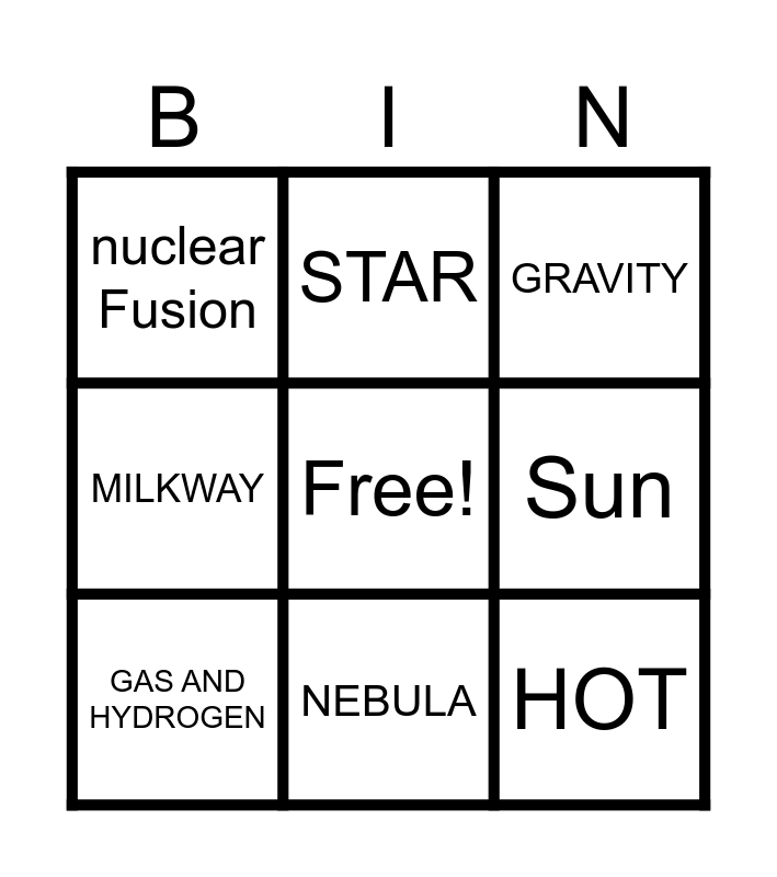 This bingo card has a free space and 8 words: Sun, GRAVITY, STAR, GAS AND HYDROGEN, nuclear Fusion, HOT, MILKWAY and NEBULA.