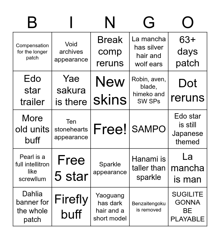 This bingo card has a free space and 24 words: Free 5 star, Firefly buff, New skins, Dahlia banner for the whole patch, 63+ days patch, Compensation for the longer patch, Edo star trailer, Void archives appearance, SAMPO, Sparkle appearance, Robin, aven, blade, himeko and SW SPs, More old units buff, Hanami is taller than sparkle, La mancha is man, Yae sakura is there, Benzaitengoku is removed, Edo star is still Japanese themed, Break comp reruns, Dot reruns, Ten stonehearts appearance, SUGILITE GONNA BE PLAYABLE, Pearl is a full intellitron like screwllum, La mancha has silver hair and wolf ears and Yaoguang has dark hair and a short model.