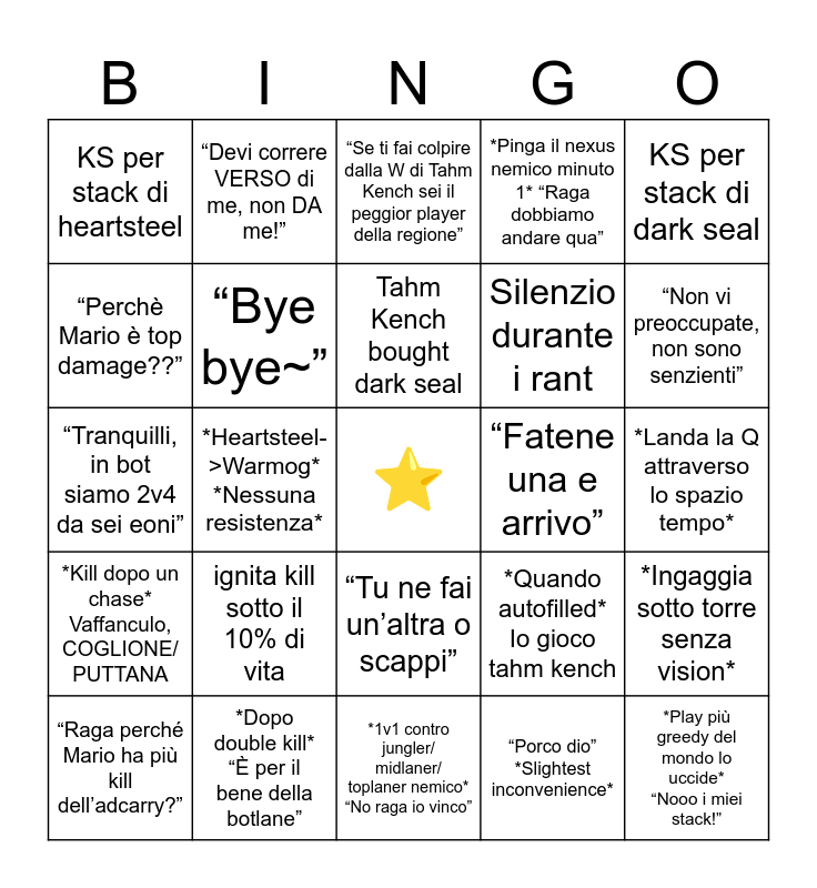 This bingo card has a free space and 24 words: ignita kill sotto il 10% di vita, *Dopo double kill* “È per il bene della botlane”, Tahm Kench bought dark seal, “Raga perché Mario ha più kill dell’adcarry?”, KS per stack di dark seal, KS per stack di heartsteel, “Perchè Mario è top damage??”, “Devi correre VERSO di me, non DA me!”, “Fatene una e arrivo”, “Tu ne fai un’altra o scappi”, Silenzio durante i rant, “Tranquilli, in bot siamo 2v4 da sei eoni”, *Quando autofilled* Io gioco tahm kench, *Ingaggia sotto torre senza vision*, “Bye bye~”, “Porco dio” *Slightest inconvenience*, *Landa la Q attraverso lo spazio tempo*, “Se ti fai colpire dalla W di Tahm Kench sei il peggior player della regione”, “Non vi preoccupate, non sono senzienti”, *Heartsteel->Warmog* *Nessuna resistenza*, *Play più greedy del mondo lo uccide* “Nooo i miei stack!”, *Kill dopo un chase* Vaffanculo, COGLIONE/ PUTTANA, *Pinga il nexus nemico minuto 1* “Raga dobbiamo andare qua” and *1v1 contro jungler/ midlaner/ toplaner nemico* “No raga io vinco”.