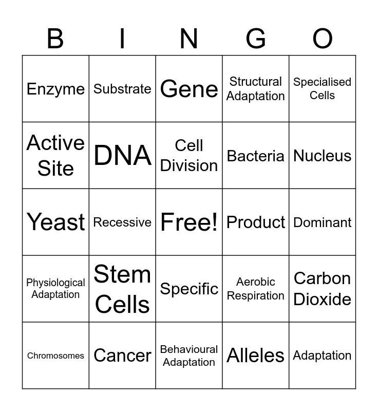 This bingo card has a free space and 24 words: Stem Cells, Cancer, Cell Division, Chromosomes, Specialised Cells, Enzyme, Active Site, Substrate, Product, Specific, Bacteria, Yeast, Aerobic Respiration, Carbon Dioxide, DNA, Alleles, Dominant, Gene, Nucleus, Recessive, Adaptation, Physiological Adaptation, Structural Adaptation and Behavioural Adaptation.