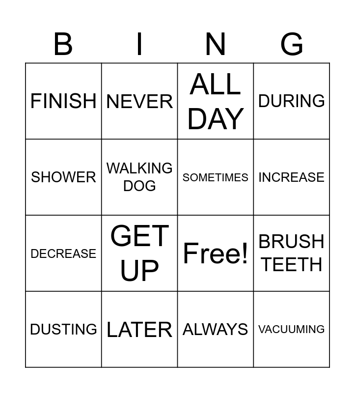 This bingo card has 21 words: LATER, EARLY, NEVER, OFTEN, ALWAYS, SOMETIMES, FINISH, ALL DAY, Free!, INCREASE, DECREASE, DURING, VACUUMING, WASHING DISHES, WALKING DOG, CLEANING, DUSTING, GET UP, SHOWER, BRUSH TEETH and GET-DRESSED.