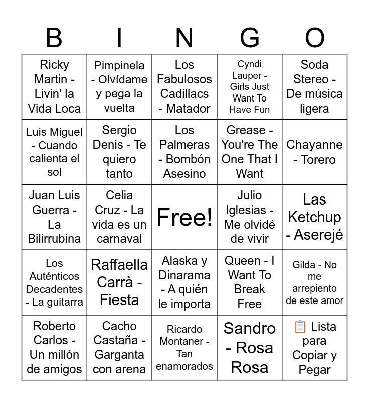 This bingo card has a free space and 53 words: ​📋 Lista para Copiar y Pegar ​(Copia esta lista tal cual y pĂ©gala en el generador de cartones de Bingo) ​Sandro - Rosa Rosa ​Raffaella CarrĂ - Fiesta ​ABBA - Dancing Queen ​Pimpinela - OlvĂdame y pega la vuelta ​Gloria Gaynor - I Will Survive ​Luis, ​📋 Lista para Copiar y Pegar, ​(Copia esta lista tal cual y pĂ©gala en el generador de cartones de Bingo), ​Sandro - Rosa Rosa, ​Raffaella CarrĂ - Fiesta, ​ABBA - Dancing Queen, ​Pimpinela - OlvĂdame y pega la vuelta, ​Gloria Gaynor - I Will Survive, ​Luis Miguel - Cuando calienta el sol, ​Palito Ortega - La Felicidad, ​Sergio Denis - Te quiero tanto, ​Camilo Sesto - Vivir asĂ es morir de amor, ​Gilda - No me arrepiento de este amor, ​Queen - I Want To Break Free, ​Valeria Lynch - Me das cada dĂa más, ​Roberto Carlos - Un millĂłn de amigos, ​Los Palmeras - BombĂłn Asesino, ​Julio Iglesias - Me olvidĂ© de vivir, ​Bee Gees - Stayin' Alive, ​Soda Stereo - De mĂşsica ligera, ​Celia Cruz - La vida es un carnaval, ​JosĂ© Luis Perales - Y cĂłmo es Ă©l, ​Grease - You're The One That I Want, ​Ricky Martin - Livin' la Vida Loca, ​Village People - Y.M.C.A., ​Cacho Castaña - Garganta con arena, ​Nino Bravo - Un beso y una flor, ​Los Twist - El estudiante (Cleopatra), ​Madonna - La Isla Bonita, ​Chayanne - Torero, ​AzĂşcar Moreno - Solo se vive una vez, ​Frank Sinatra - New York, New York, ​Cristian Castro - Azul, ​The Police - Every Breath You Take, ​Mercedes Sosa - Solo le pido a Dios, ​Xuxa - IlariĂ©, ​Cyndi Lauper - Girls Just Want To Have Fun, ​Ricardo Montaner - Tan enamorados, ​Los Fabulosos Cadillacs - Matador, ​Elvis Presley - Jailhouse Rock, ​Marco Antonio SolĂs - Si no te hubieras ido, ​Estela Raval - ResistirĂ©, ​Las Ketchup - AserejĂ©, ​Maná - Rayando el sol, ​Violeta Rivas - El baile del ladrillo, ​Alaska y Dinarama - A quiĂ©n le importa, ​Dyango - CorazĂłn mágico, ​Fabiana Cantilo - Mi enfermedad, ​Juan Luis Guerra - La Bilirrubina, ​Los AutĂ©nticos Decadentes - La guitarra, ​El SĂmbolo - 1, 2, 3, ​Isabel Pantoja - Se me enamora el alma and ​Rodrigo - La mano de Dios (u Ocho Cuarenta).