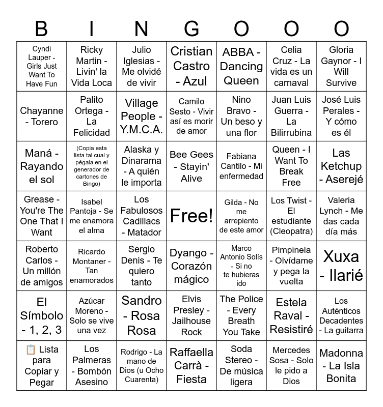 This bingo card has a free space and 52 words: ​📋 Lista para Copiar y Pegar, ​(Copia esta lista tal cual y pĂ©gala en el generador de cartones de Bingo), ​Sandro - Rosa Rosa, ​Raffaella CarrĂ - Fiesta, ​ABBA - Dancing Queen, ​Pimpinela - OlvĂdame y pega la vuelta, ​Gloria Gaynor - I Will Survive, ​Luis Miguel - Cuando calienta el sol, ​Palito Ortega - La Felicidad, ​Sergio Denis - Te quiero tanto, ​Camilo Sesto - Vivir asĂ es morir de amor, ​Gilda - No me arrepiento de este amor, ​Queen - I Want To Break Free, ​Valeria Lynch - Me das cada dĂa más, ​Roberto Carlos - Un millĂłn de amigos, ​Los Palmeras - BombĂłn Asesino, ​Julio Iglesias - Me olvidĂ© de vivir, ​Bee Gees - Stayin' Alive, ​Soda Stereo - De mĂşsica ligera, ​Celia Cruz - La vida es un carnaval, ​JosĂ© Luis Perales - Y cĂłmo es Ă©l, ​Grease - You're The One That I Want, ​Ricky Martin - Livin' la Vida Loca, ​Village People - Y.M.C.A., ​Cacho Castaña - Garganta con arena, ​Nino Bravo - Un beso y una flor, ​Los Twist - El estudiante (Cleopatra), ​Madonna - La Isla Bonita, ​Chayanne - Torero, ​AzĂşcar Moreno - Solo se vive una vez, ​Frank Sinatra - New York, New York, ​Cristian Castro - Azul, ​The Police - Every Breath You Take, ​Mercedes Sosa - Solo le pido a Dios, ​Xuxa - IlariĂ©, ​Cyndi Lauper - Girls Just Want To Have Fun, ​Ricardo Montaner - Tan enamorados, ​Los Fabulosos Cadillacs - Matador, ​Elvis Presley - Jailhouse Rock, ​Marco Antonio SolĂs - Si no te hubieras ido, ​Estela Raval - ResistirĂ©, ​Las Ketchup - AserejĂ©, ​Maná - Rayando el sol, ​Violeta Rivas - El baile del ladrillo, ​Alaska y Dinarama - A quiĂ©n le importa, ​Dyango - CorazĂłn mágico, ​Fabiana Cantilo - Mi enfermedad, ​Juan Luis Guerra - La Bilirrubina, ​Los AutĂ©nticos Decadentes - La guitarra, ​El SĂmbolo - 1, 2, 3, ​Isabel Pantoja - Se me enamora el alma and ​Rodrigo - La mano de Dios (u Ocho Cuarenta).