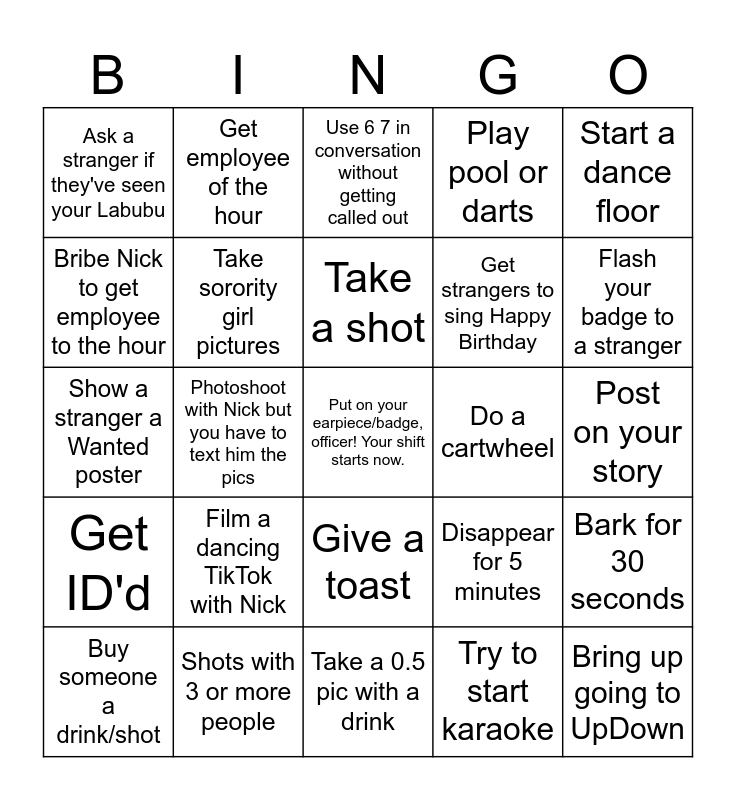 This bingo card has a free space and 25 words: Film a dancing TikTok with Nick, Take a 0.5 pic with a drink, Take a shot, Buy someone a drink/shot, Start a dance floor, Ask a stranger if they've seen your Labubu, Bribe Nick to get employee to the hour, Get employee of the hour, Do a cartwheel, Give a toast, Get strangers to sing Happy Birthday, Show a stranger a Wanted poster, Disappear for 5 minutes, Bark for 30 seconds, Take sorority girl pictures, FaceTime someone and convince them you met Taylor Swift, Post on your story, Use 6 7 in conversation without getting called out, Flash your badge to a stranger, Photoshoot with Nick but you have to text him the pics, Bring up going to UpDown, Shots with 3 or more people, Get ID'd, Play pool or darts and Try to start karaoke.
