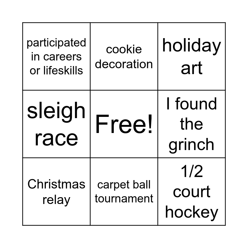This bingo card has a free space and 8 words: I found the grinch, holiday art, cookie decoration, Christmas relay, participated in careers or lifeskills, 1/2 court hockey, sleigh race and carpet ball tournament.