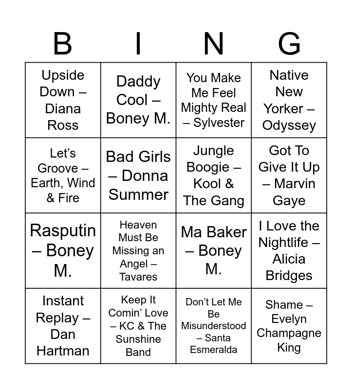 This bingo card has 36 words: Free!, More, More, More – Andrea True Connection, Boogie Shoes – KC & The Sunshine Band, Jungle Boogie – Kool & The Gang, Lady Marmalade – Labelle, Shame – Evelyn Champagne King, Got To Give It Up – Marvin Gaye, Rock the Boat – Hues Corporation, Let’s Groove – Earth, Wind & Fire, Don’t Stop the Music – Yarbrough & Peoples, I Love the Nightlife – Alicia Bridges, Native New Yorker – Odyssey, Relight My Fire – Dan Hartman, Keep It Comin’ Love – KC & The Sunshine Band, Heaven Must Be Missing an Angel – Tavares, Upside Down – Diana Ross, Love Is in the Air – John Paul Young, Born to Be Wild – Steppenwolf, Instant Replay – Dan Hartman, You Make Me Feel Mighty Real – Sylvester, Don’t Let Me Be Misunderstood – Santa Esmeralda, Best Disco in Town – The Ritchie Family, Spacer – Sheila & B. Devotion, In the Navy – Village People, Romeo and Juliet – Alec R. Costandinos, Daddy Cool – Boney M., Ma Baker – Boney M., Yes Sir, I Can Boogie – Baccara, Rasputin – Boney M., Bad Girls – Donna Summer, Fly Robin Fly – Silver Convention, The Night the Lights Went Out – The Trammps, Magic Fly – Space, A Fifth of Beethoven – Walter Murphy, Cuba – Gibson Brothers and Zing Went the Strings of My Heart – The Trammps.