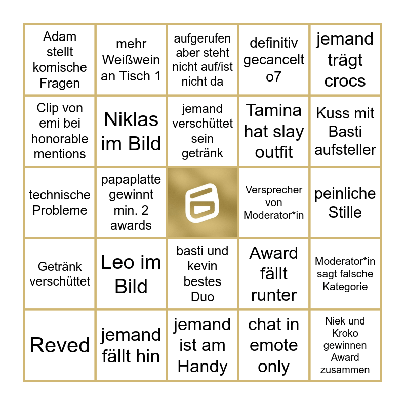 This bingo card has a free space and 24 words: Leo im Bild, jemand fällt hin, jemand verschüttet sein getränk, Reved, jemand trägt crocs, Adam stellt komische Fragen, Clip von emi bei honorable mentions, mehr Weißwein an Tisch 1, Versprecher von Moderator*in, basti und kevin bestes Duo, Tamina hat slay outfit, technische Probleme, Award fällt runter, Moderator*in sagt falsche Kategorie, Niklas im Bild, chat in emote only, peinliche Stille, aufgerufen aber steht nicht auf/ist nicht da, Kuss mit Basti aufsteller, papaplatte gewinnt min. 2 awards, Niek und Kroko gewinnen Award zusammen, Getränk verschüttet, definitiv gecancelt o7 and jemand ist am Handy.