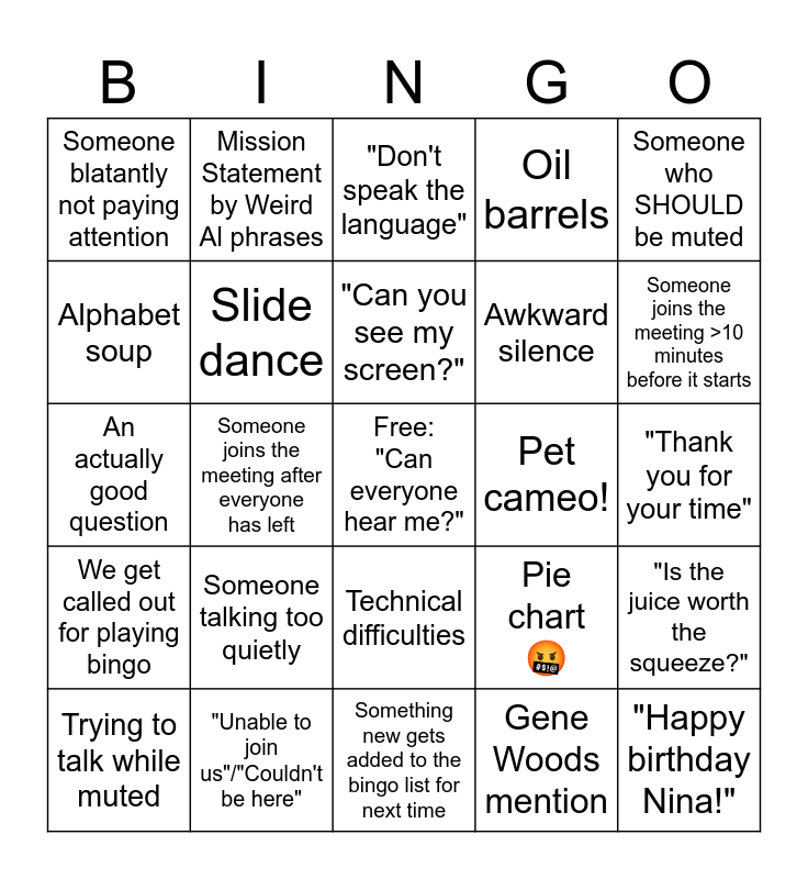 This bingo card has a free space and 24 words: Someone talking too quietly, "Unable to join us"/"Couldn't be here", "Can you see my screen?", Trying to talk while muted, Someone who SHOULD be muted, Someone blatantly not paying attention, Alphabet soup, Mission Statement by Weird Al phrases, Pet cameo!, Technical difficulties, Awkward silence, An actually good question, Pie chart 🤬, "Is the juice worth the squeeze?", Slide dance, Gene Woods mention, "Thank you for your time", "Don't speak the language", Someone joins the meeting >10 minutes before it starts, Someone joins the meeting after everyone has left, "Happy birthday Nina!", We get called out for playing bingo, Oil barrels and Something new gets added to the bingo list for next time.