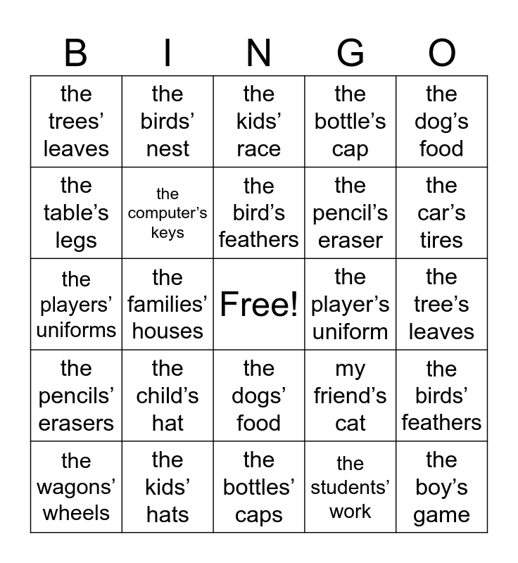 This bingo card has a free space and 24 words: the child’s hat, the kids’ hats, the bird’s feathers, the wagons’ wheels, the dog’s food, the trees’ leaves, the table’s legs, the birds’ nest, the player’s uniform, the dogs’ food, the pencil’s eraser, the players’ uniforms, my friend’s cat, the birds’ feathers, the computer’s keys, the students’ work, the tree’s leaves, the kids’ race, the car’s tires, the families’ houses, the boy’s game, the pencils’ erasers, the bottle’s cap and the bottles’ caps.