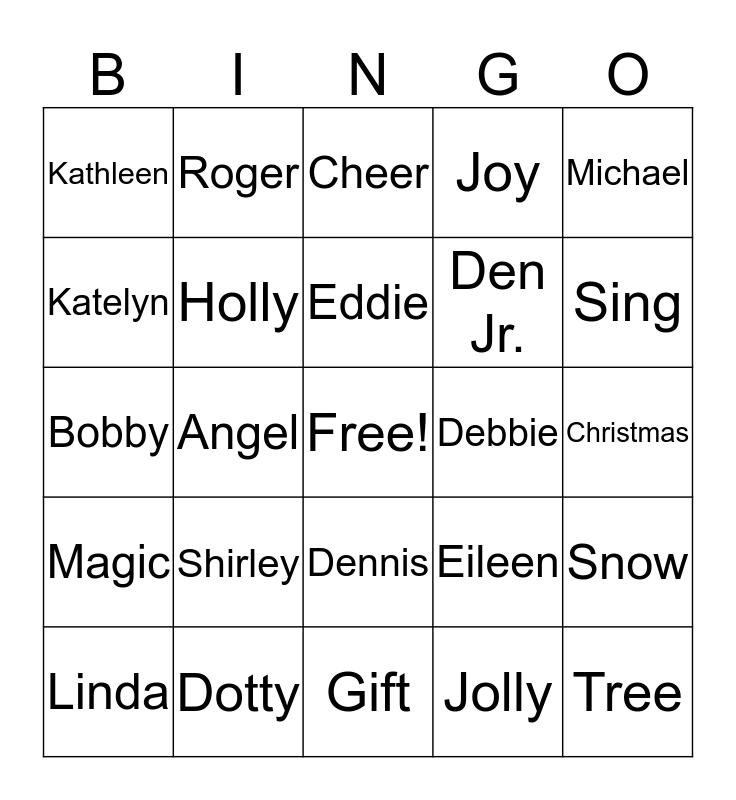 This bingo card has a free space and 24 words: Shirley, Dotty, Eddie, Linda, Michael, Kathleen, Katelyn, Roger, Debbie, Dennis, Den Jr., Bobby, Eileen, Snow, Holly, Jolly, Christmas, Cheer, Sing, Angel, Tree, Magic, Joy and Gift.