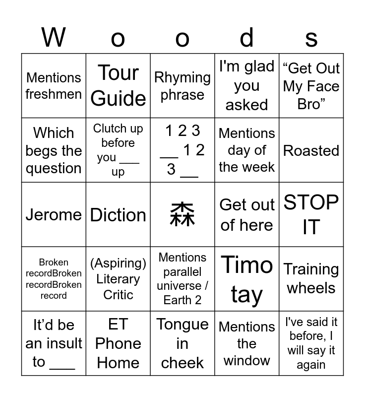 This bingo card has a free space and 47 words: Proverbial, I've said it before, I will say it again, (But) here's the thing, Tongue in cheek, (Aspiring) Literary Critic, “Bad Person”, Tour Guide, smərt, Which begs the question, Work with me, Clutch up before you ___ up, I'm glad you asked, Training wheels, Timo tay, Quite literally, Ahn ree, 1 2 3 __ 1 2 3 __, Get out of here, Can we agree that __?, “Get Out My Face Bro”, Diction, Mentions the window, Mentions freshmen, Mentions day of the week, “Favorite A4 class (this year)”, Roasted, It’d be an insult to ___, Mentions the zoo, Mentions parallel universe / Earth 2, Broken recordBroken recordBroken record, Batman reference (including other characters), All up in my grill, Having said that/with that being said, Mentions the bank, and we are back, ET Phone Home, STOP IT, Put me in coach, And by __ I mean __, Bless me because its not about you, War and Peace, Rhyming phrase, Jerome, Lets out a hearty chuckle at his own joke, Don't be a jerk take out your work, Too soon? and Levi not present (physically or mentally).
