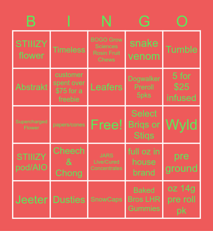 This bingo card has a free space and 24 words: Cheech & Chong, Dusties, Leafers, Jeeter, Tumble, STIIIZY flower, Abstrakt, Timeless, Select Briqs or Stiqs, JARS Live/Cured Concentrates, Dogwalker Preroll 5pks, Supercharged Flower, full oz in house brand, pre ground, customer spent over $75 for a freebie, Baked Bros LHR Gummies, Wyld, BOGO Grow Sciences Rosin Fruit Chews, 5 for $25 infused, papers/cones, oz 14g pre roll pk, STIIIZY pod/AIO, snake venom and SnowCaps.