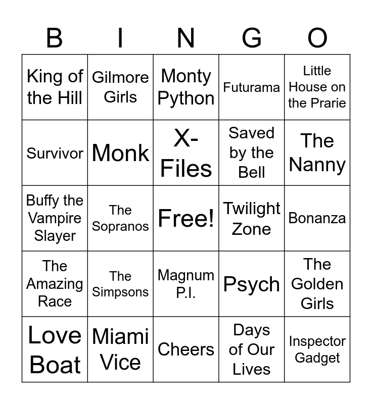 This bingo card has a free space and 50 words: Friends, Inspector Gadget, Seinfeld, Cheers, The Simpsons, Big Bang Theory, Gilmore Girls, Grey's Anatomy, Survivor, The Office, Monk, Futurama, The Golden Girls, Psych, MASH, Gilligan's Island, X-Files, Twilight Zone, The Brady Bunch, Little House on the Prarie, The Sopranos, Days of Our Lives, King of the Hill, Saved by the Bell, Hawaii 5-0, Law & Order, The Nanny, The People's Court, Monty Python, Magnum P.I., Alf, American Idol, Family Matters, Full House, Miami Vice, COPS, Beverly Hills 90210, Good Times, Charlies Angels, Bonanza, Macgyver, Game of Thrones, Roseanne, Shameless, Love Boat, Buffy the Vampire Slayer, Saturday Night Live, Everybody Loves Raymond, The Amazing Race and The Fresh Prince of Bel-Air.