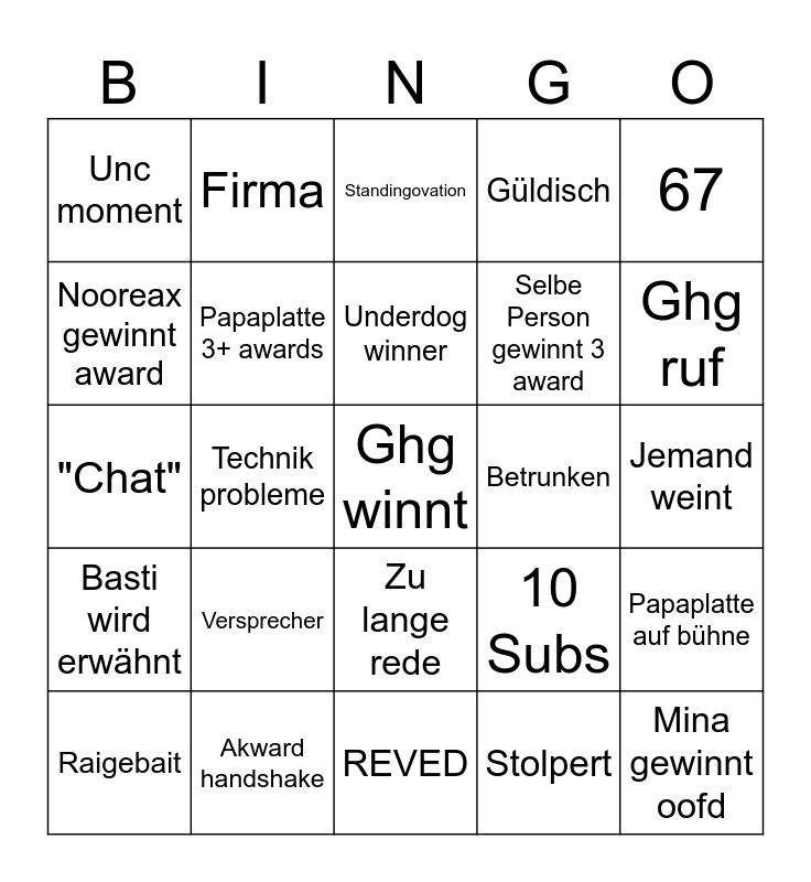 This bingo card has 25 words: Versprecher, REVED, Underdog winner, Raigebait, 67, Unc moment, Nooreax gewinnt award, Firma, Betrunken, Zu lange rede, Selbe Person gewinnt 3 award, "Chat", 10 Subs, Papaplatte auf bühne, Papaplatte 3+ awards, Mina gewinnt oofd, Jemand weint, Standingovation, Ghg ruf, Technik probleme, Ghg winnt, Akward handshake, Basti wird erwähnt, Güldisch and Stolpert.