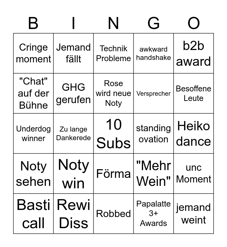 This bingo card has a free space and 24 words: Noty win, Rewi Diss, Rose wird neue Noty, Basti call, b2b award, Cringe moment, "Chat" auf der Bühne, Jemand fällt, standing ovation, Förma, Versprecher, Underdog winner, "Mehr Wein", unc Moment, GHG gerufen, Papalatte 3+ Awards, Heiko dance, Technik Probleme, Besoffene Leute, Zu lange Dankerede, jemand weint, Noty sehen, awkward handshake and Robbed.