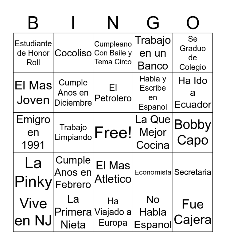 This bingo card has a free space and 24 words: Cumple Anos en Febrero, La Primera Nieta, El Petrolero, Vive en NJ, Se Graduo de Colegio, Estudiante de Honor Roll, El Mas Joven, Cocoliso, La Que Mejor Cocina, El Mas Atletico, Habla y Escribe en Espanol, Emigro en 1991, Economista, Secretaria, Cumple Anos en Diciembre, No Habla Espanol, Bobby Capo, Cumpleano Con Baile y Tema Circo, Ha Ido a Ecuador, Trabajo Limpiando, Fue Cajera, La Pinky, Trabajo en un Banco and Ha Viajado a Europa.