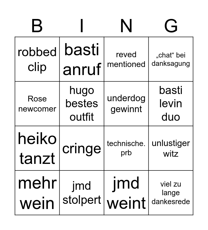 This bingo card has 16 words: jmd stolpert, unlustiger witz, reved mentioned, robbed clip, heiko tanzt, basti anruf, technische. prb, jmd weint, Rose newcomer, hugo bestes outfit, mehr wein, „chat“ bei danksagung, cringe, basti levin duo, underdog gewinnt and viel zu lange dankesrede.
