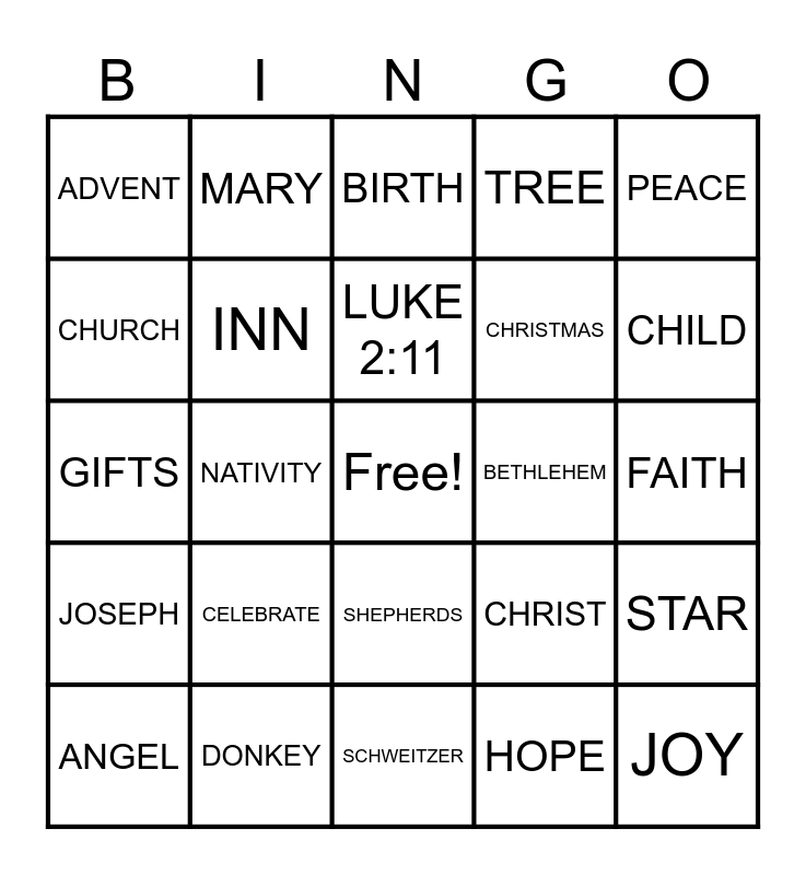 This bingo card has a free space and 27 words: CHRIST, JESUS, CHRISTMAS, SCHWEITZER, CHURCH, BIRTH, MARY, JOSEPH, BETHLEHEM, STAR, GIFTS, TREE, ANGEL, DONKEY, CHILD, SON, INN, LUKE 2:11, CELEBRATE, ADVENT, FAITH, HOPE, NATIVITY, JOY, SHEPHERDS, PEACE and WORSHIP.
