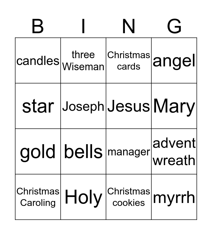 This bingo card has 17 words: Christmas cookies, Christmas Caroling, Christmas cards, candles, bells, angel, advent wreath, Jesus, Mary, Joseph, Holy, manager, star, three Wiseman, gold, frankincense and myrrh.