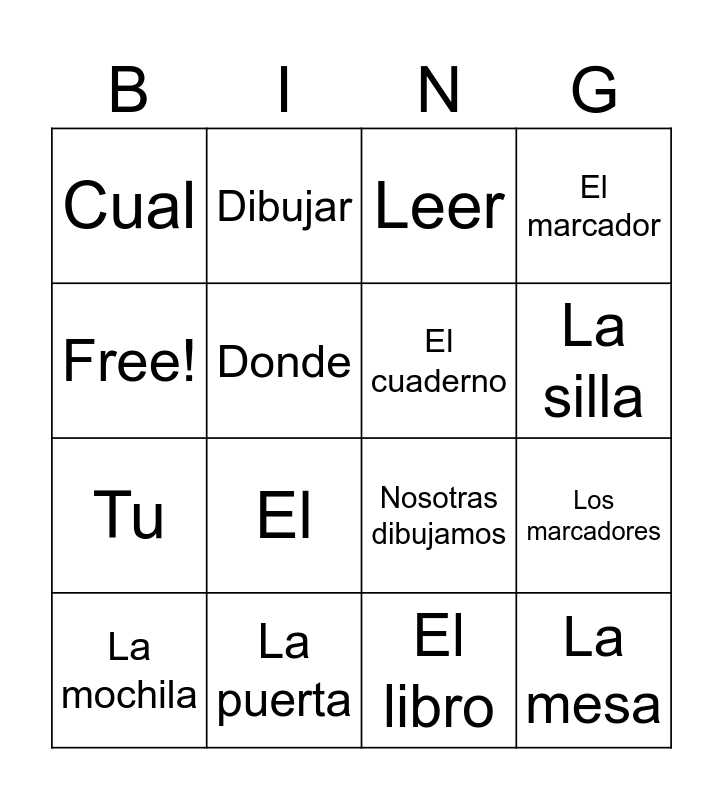This bingo card has 39 words: El sacapuntas, El lapiz, La regla, El cuaderno, La carpeta, Las tijeras, La silla, El escritorio, Free!, La mesa, Los marcadores, El marcador, La mochila, El libro, La puerta, Cuando, Cuantos, Cual, Que, Quien, Donde, Yo, Tu, El, Ella, Nosotros, Ellos, Estudiar, Enseñar, Dibujar, Contar, Aprender, Leer, Escribir, Yo cuento, Tu estudias, El lee, Nosotras dibujamos and Ustedes escriben.