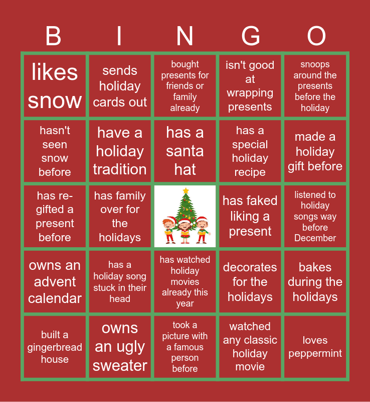 This bingo card has a free space and 24 words: has a holiday song stuck in their head, owns an ugly sweater, has a santa hat, built a gingerbread house, snoops around the presents before the holiday, likes snow, hasn't seen snow before, sends holiday cards out, has faked liking a present, has watched holiday movies already this year, has a special holiday recipe, has re-gifted a present before, decorates for the holidays, bakes during the holidays, have a holiday tradition, watched any classic holiday movie, listened to holiday songs way before December, bought presents for friends or family already, made a holiday gift before, has family over for the holidays, loves peppermint, owns an advent calendar, isn't good at wrapping presents and took a picture with a famous person before.