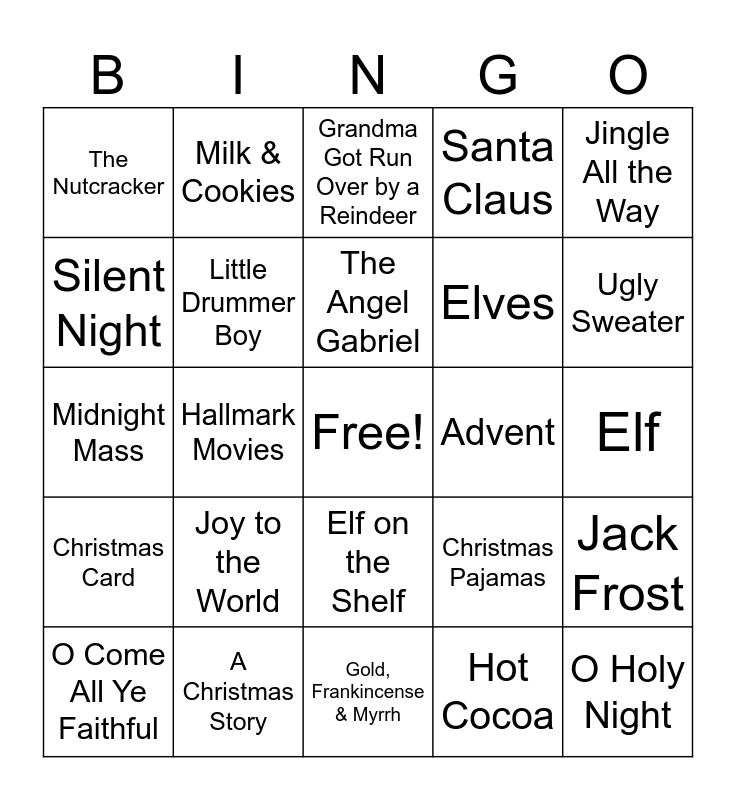 This bingo card has a free space and 70 words: Home Alone, Elf, The Grinch, It’s a Wonderful Life, A Christmas Story, Miracle on 34th Street, Santa Claus, Frosty the Snowman, Jingle All the Way, Cindy Lou Who, Jack Frost, Scrooge, The Nutcracker, Grandma Got Run Over by a Reindeer, Mall Santa, Hallmark Movies, Elf on the Shelf, Elves, Caroling, Christmas Card, Advent, Christmas Pajamas, Ugly Sweater, Mistletoe, Gingerbread House, Eggnog, Candy Canes, Snowflakes, Hot Cocoa, Christmas Tree, Milk & Cookies, Wreath, Snow Globe, Christmas Village, Santa’s Workshop, Christmas Pickle, Ice Skating, Rockefeller Tree Lighting, Jingle Bells, Silent Night, Away in a Manger, Joy to the World, O Holy Night, Deck the Halls, All I Want for Christmas Is You, Little Drummer Boy, O Come All Ye Faithful, Hark! The Herald Angels Sing, Sleigh Ride, Winter Wonderland, Jesus, The Nativity, The Inn with No Room, Three Wise Men, Gold, Frankincense & Myrrh, Bethlehem, The Angel Gabriel, Emmanuel, Peace on Earth, Candlelight Services, Midnight Mass, Merry Christmas, Happy Holidays, Seasons Greetings, Let It Snow!, Merry and Bright, Holly Jolly, Believe, Christmas Cheer and Christmas Lights.