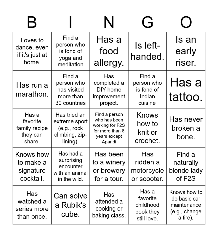 This bingo card has a free space and 24 words: Has had a surprising encounter with an animal in the wild., Can solve a Rubik's cube., Has completed a DIY home improvement project., Has watched a series more than once., Is an early riser., Loves to dance, even if it's just at home., Has run a marathon., Find a person who is fond of yoga and meditation, Knows how to knit or crochet., Has been to a winery or brewery for a tour., Find a person who is fond of Indian cuisine, Has a favorite family recipe they can share., Has ridden a motorcycle or scooter., Find a naturally blonde lady of F2S, Find a person who has visited more than 30 countries, Has a favorite childhood book they still love., Has never broken a bone., Has a food allergy., Has a tattoo., Has tried an extreme sport (e.g., rock climbing, zip-lining)., Knows how to do basic car maintenance (e.g., change a tire)., Knows how to make a signature cocktail., Is left-handed. and Has attended a cooking or baking class..