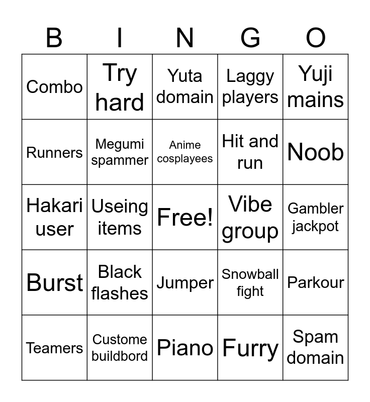 This bingo card has a free space and 24 words: Teamers, Black flashes, Anime cosplayees, Furry, Yuji mains, Combo, Try hard, Yuta domain, Vibe group, Gambler jackpot, Hakari user, Megumi spammer, Snowball fight, Parkour, Runners, Custome buildbord, Piano, Laggy players, Noob, Burst, Useing items, Jumper, Hit and run and Spam domain.