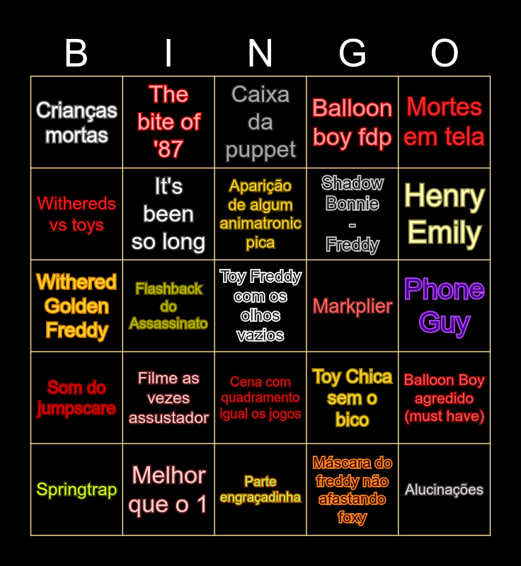 This bingo card has a free space and 24 words: Filme as vezes assustador, Melhor que o 1, Aparição de algum animatronic pica, Springtrap, Mortes em tela, Crianças mortas, Withereds vs toys, The bite of '87, Markplier, Cena com quadramento igual os jogos, Shadow Bonnie - Freddy, Withered Golden Freddy, Toy Chica sem o bico, Balloon Boy agredido (must have), It's been so long, Máscara do freddy não afastando foxy, Phone Guy, Caixa da puppet, Henry Emily, Flashback do Assassinato, Alucinações, Som do jumpscare, Balloon boy fdp and Parte engraçadinha.