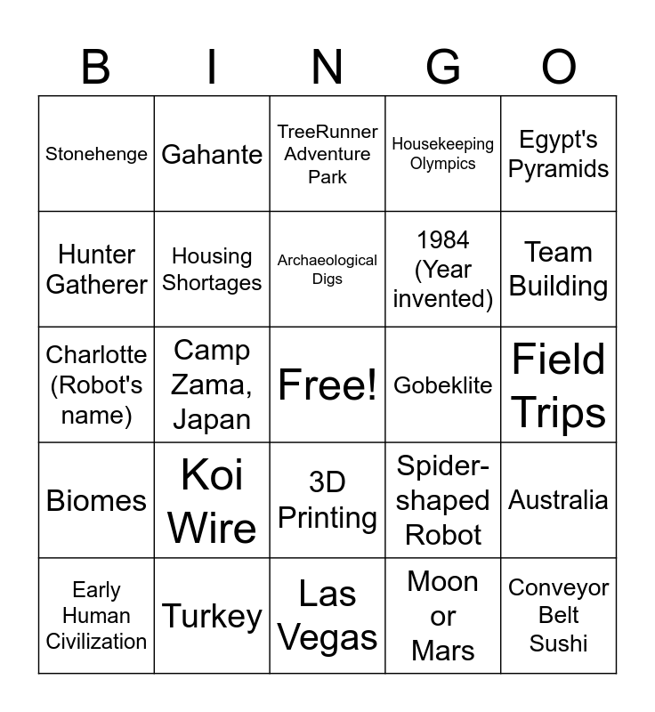 This bingo card has a free space and 24 words: Koi Wire, Turkey, Archaeological Digs, Early Human Civilization, Egypt's Pyramids, Stonehenge, Hunter Gatherer, Gahante, Gobeklite, 3D Printing, 1984 (Year invented), Charlotte (Robot's name), Spider-shaped Robot, Australia, Housing Shortages, Moon or Mars, Field Trips, TreeRunner Adventure Park, Team Building, Camp Zama, Japan, Conveyor Belt Sushi, Biomes, Housekeeping Olympics and Las Vegas.