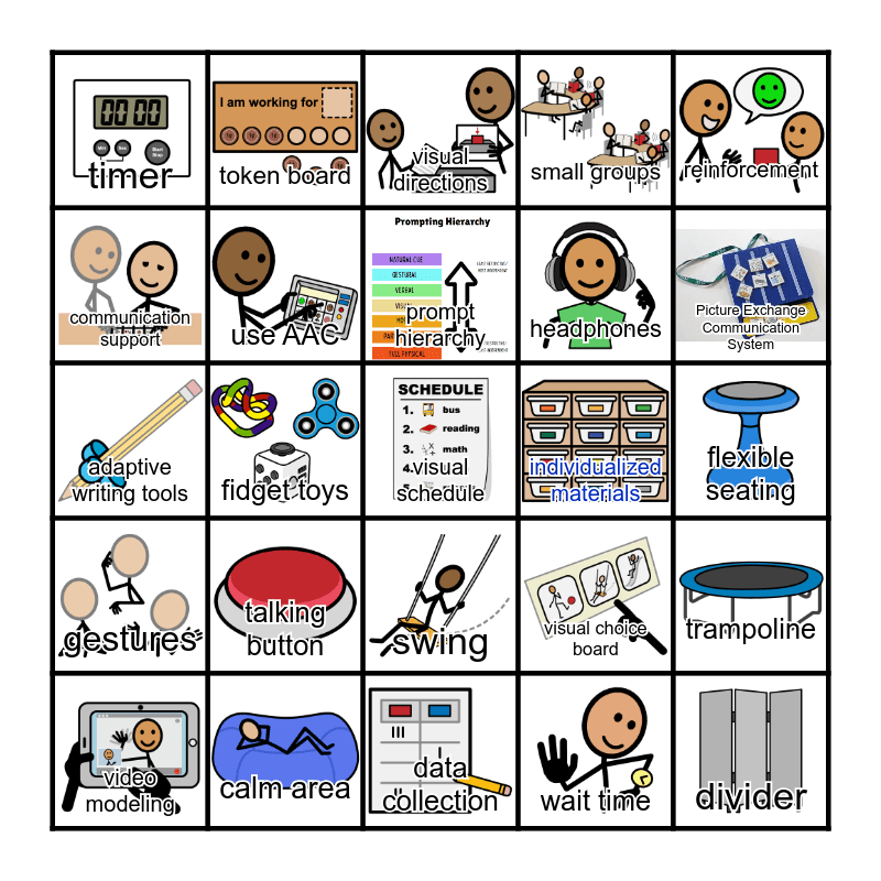 This bingo card has 25 images and 25 words: talking button, data collection, prompt hierarchy, video modeling, reinforcement, timer, communication support, token board, individualized materials, swing, headphones, adaptive writing tools, visual choice board, trampoline, use AAC, divider, flexible seating, visual directions, Picture Exchange Communication System, fidget toys, visual schedule, calm area, gestures, small groups and wait time.