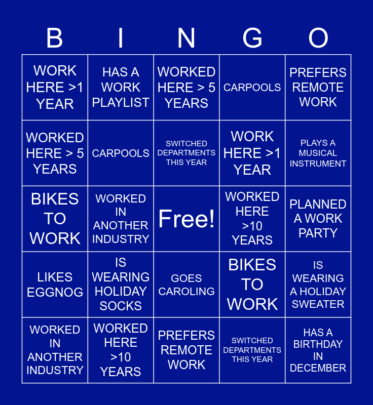 This bingo card has a free space and 31 words: PREFERS REMOTE WORK, PREFERS WORKING IN OFFICE, WORKED IN ANOTHER INDUSTRY, HAS A WORK PLAYLIST, WORK HERE >1 YEAR, WORKED HERE > 5 YEARS, CARPOOLS, BIKES TO WORK, WORKED HERE >10 YEARS, SWITCHED DEPARTMENTS THIS YEAR, PLANNED A WORK PARTY, HAS A BIRTHDAY IN DECEMBER, IS WEARING A SANTA HAT, IS WEARING RED, PLAYS A MUSICAL INSTRUMENT, HOSTS A HOLIDAY PARTY AT THEIR HOUSE, IS WEARING A HOLIDAY SWEATER, IS WEARING HOLIDAY SOCKS, LIKES EGGNOG, GOES CAROLING, PREFERS REMOTE WORK, PREFERS WORKING IN OFFICE, WORKED IN ANOTHER INDUSTRY, HAS A WORK PLAYLIST, WORK HERE >1 YEAR, WORKED HERE > 5 YEARS, CARPOOLS, BIKES TO WORK, WORKED HERE >10 YEARS, SWITCHED DEPARTMENTS THIS YEAR and PLANNED A WORK PARTY.
