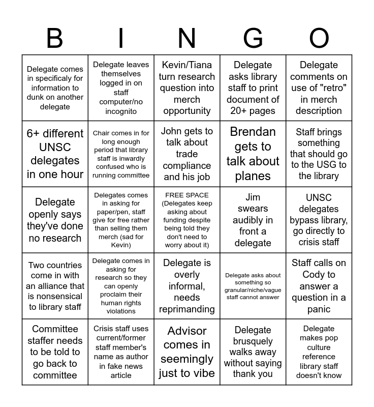 This bingo card has a free space and 24 words: Delegate comes in asking for research so they can openly proclaim their human rights violations, Crisis staff uses current/former staff member's name as author in fake news article, John gets to talk about trade compliance and his job, Committee staffer needs to be told to go back to committee, Delegate comments on use of "retro" in merch description, Delegate comes in specificaly for information to dunk on another delegate, 6+ different UNSC delegates in one hour, Delegate leaves themselves logged in on staff computer/no incognito, Jim swears audibly in front a delegate, Delegate is overly informal, needs reprimanding, Brendan gets to talk about planes, Delegate openly says they've done no research, Delegate asks about something so granular/niche/vague staff cannot answer, Staff calls on Cody to answer a question in a panic, Chair comes in for long enough period that library staff is inwardly confused who is running committee, Delegate brusquely walks away without saying thank you, UNSC delegates bypass library, go directly to crisis staff, Kevin/Tiana turn research question into merch opportunity, Staff brings something that should go to the USG to the library, Delegates comes in asking for paper/pen, staff give for free rather than selling them merch (sad for Kevin), Delegate makes pop culture reference library staff doesn't know, Two countries come in with an alliance that is nonsensical to library staff, Delegate asks library staff to print document of 20+ pages and Advisor comes in seemingly just to vibe.
