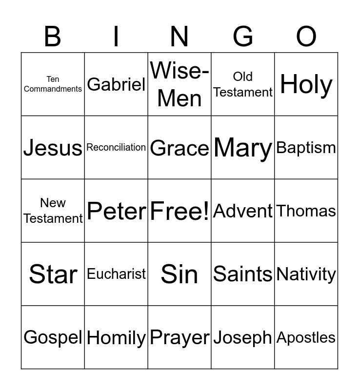 This bingo card has a free space and 28 words: Nativity, Bethlehem, Mary, Joseph, Jesus, Wise-Men, Gabriel, Star, Advent, Gospel, New Testament, Old Testament, Homily, Prayer, Baptism, Sacraments, Eucharist, Reconciliation, Grace, Sin, Ten Commandments, Moses, Apostles, Peter, Thomas, Saints, Holy and Trinity.