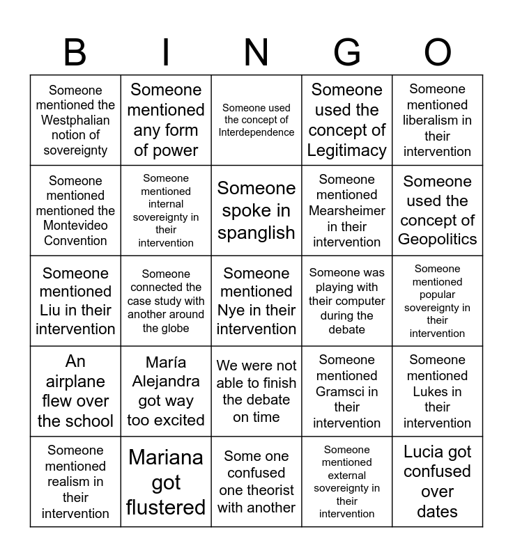 This bingo card has a free space and 24 words: María Alejandra got way too excited, Mariana got flustered, Someone spoke in spanglish, Someone mentioned realism in their intervention, Someone mentioned liberalism in their intervention, Someone mentioned the Westphalian notion of sovereignty, Someone mentioned mentioned the Montevideo Convention, Someone mentioned any form of power, Someone was playing with their computer during the debate, We were not able to finish the debate on time, Someone mentioned Mearsheimer in their intervention, Someone mentioned Liu in their intervention, Someone mentioned Gramsci in their intervention, Someone mentioned Lukes in their intervention, Someone mentioned internal sovereignty in their intervention, Someone mentioned external sovereignty in their intervention, Someone mentioned popular sovereignty in their intervention, Someone used the concept of Interdependence, Someone used the concept of Geopolitics, Someone connected the case study with another around the globe, Lucia got confused over dates, An airplane flew over the school, Someone used the concept of Legitimacy and Some one confused one theorist with another.