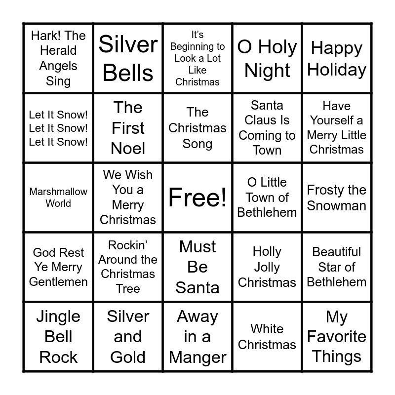 This bingo card has a free space and 51 words: Silent Night, Hallelujah, Jingle Bells, White Christmas, Frosty the Snowman, Rudolph the Red-Nosed Reindeer, Silver Bells, Deck the Halls, O Holy Night, Joy to the World, Hark! The Herald Angels Sing, The First Noel, Away in a Manger, O Little Town of Bethlehem, It Came Upon a Midnight Clear, Angels We Have Heard on High, We Wish You a Merry Christmas, The Christmas Song, I’ll Be Home for Christmas, Have Yourself a Merry Little Christmas, Let It Snow! Let It Snow! Let It Snow!, Winter Wonderland, It’s Beginning to Look a Lot Like Christmas, Santa Claus Is Coming to Town, Here Comes Santa Claus, Jingle Bell Rock, Rockin’ Around the Christmas Tree, Blue Christmas, Holly Jolly Christmas, Happy Holiday, Sleigh Ride, Little Drummer Boy, Do You Hear What I Hear, Carol of the Bells, O Come All Ye Faithful, God Rest Ye Merry Gentlemen, Good King Wenceslas, What Child Is This, I Saw Mommy Kissing Santa Claus, Up on the Housetop, Marshmallow World, Feliz Navidad, Baby, It’s Cold Outside, Christmas (Baby Please Come Home), My Favorite Things, The Most Wonderful Time of the Year, Silver and Gold, Must Be Santa, The Twelve Days of Christmas, Beautiful Star of Bethlehem and Coventry Carol.