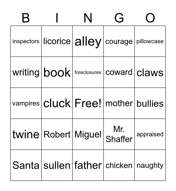 This bingo card has a free space and 26 words: Miguel, chicken, foreclosures, sullen, pillowcase, inspectors, writing, licorice, bullies, Mr. Shaffer, coward, vampires, appraised, Santa, cluck, courageous, courage, twine, alley, naughty, claws, father, mother, Robert, book and tomatoes.