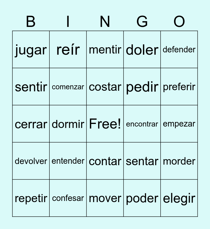 This bingo card has a free space and 41 words: almorzar, cerrar, colgar, comenzar, confesar, contar, costar, decir, defender, devolver, dormir, doler, elegir, empezar, encontrar, entender, impedir, jugar, medir, mentir, morder, morir, mover, pedir, pensar, perder, poder, probar, preferir, querer, recordar, reír, repetir, seguir, sentar, sentir, servir, soñar, sonreír, volver and volar.