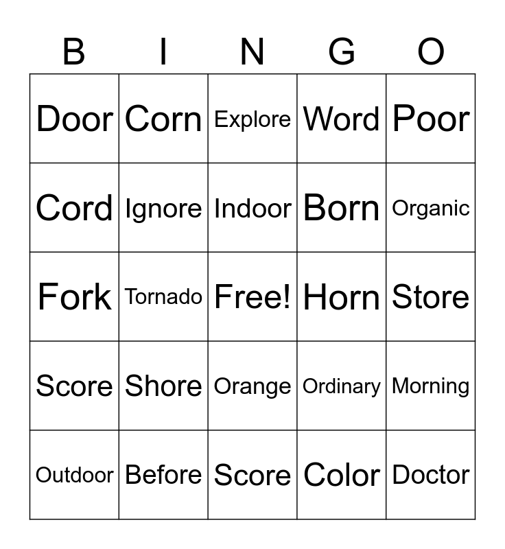 This bingo card has a free space and 30 words: Before, Popcorn, Tornado, Floor, Door, Explore, Ignore, Orange, Horn, Score, Store, Doctor, Color, Border, Organic, Orphan, Ordinary, Score, Shore, Poor, Fork, Porch, Corn, Born, Cord, Word, Morning, Outdoor, Indoor and Brainstorm.