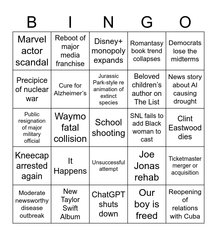 This bingo card has a free space and 24 words: It Happens, New Taylor Swift Album, Jurassic Park-style re animation of extinct species, Moderate newsworthy disease outbreak, Democrats lose the midterms, Marvel actor scandal, Precipice of nuclear war, Reboot of major media franchise, SNL fails to add Black woman to cast, Unsuccessful attempt, Beloved children’s author on The List, Public resignation of major military official, Joe Jonas rehab, Ticketmaster merger or acquisition, Cure for Alzheimer’s, Our boy is freed, Clint Eastwood dies, Disney+ monopoly expands, News story about AI causing drought, Waymo fatal collision, Reopening of relations with Cuba, Kneecap arrested again, Romantasy book trend collapses and ChatGPT shuts down.