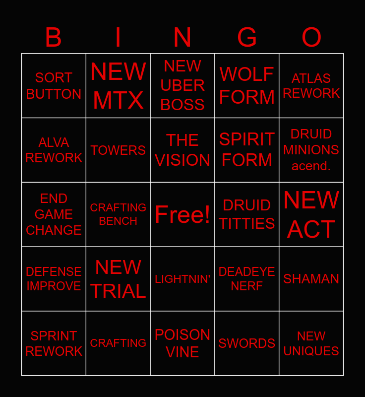 This bingo card has a free space and 24 words: NEW TRIAL, CRAFTING, THE VISION, SPRINT REWORK, ATLAS REWORK, SORT BUTTON, ALVA REWORK, NEW MTX, DRUID TITTIES, LIGHTNIN', SPIRIT FORM, END GAME CHANGE, DEADEYE NERF, SHAMAN, TOWERS, SWORDS, NEW ACT, NEW UBER BOSS, DRUID MINIONS acend., CRAFTING BENCH, NEW UNIQUES, DEFENSE IMPROVE, WOLF FORM and POISON VINE.