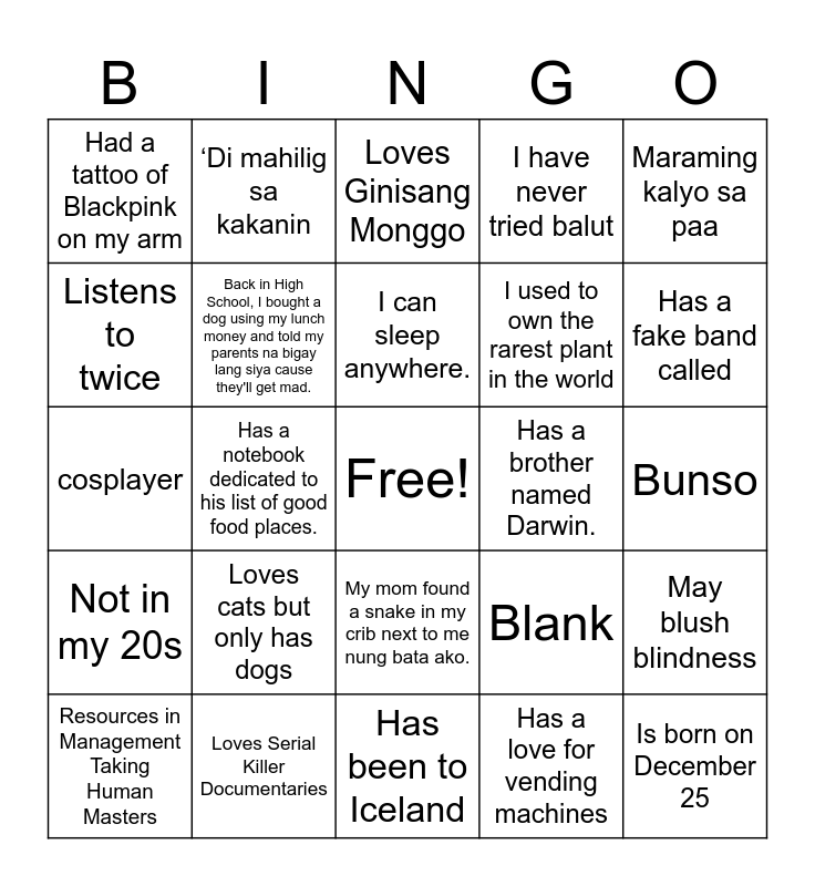 This bingo card has a free space and 86 words: I was almost named after Rico Yan., Before college, naging English teacher ako of a Chinese thoracic surgeon., My mom found a snake in my crib next to me nung bata ako., Loves pink and my melody, Was able to memorize capitals of some countries at 4 yrs old, First crush is enchong dee, Loves Spock from Star Trek, Collects vinyl records, Favorite shape is a star, Cortis stan, 500-day TikTok streak, Mobile gamer for 7hrs straight, May blush blindness, Bunso, Night Owl, I can sleep anywhere., Plays volleyball., Lived abroad for 12 years., Loves any food/drinks with matcha, Watches rap battle videos nonstop, Introvert (pero ambivert talaga), prefer mostly makunat na foods not crispy, cosplayer, kuripot, Has a love for vending machines, Spoke on radio (Magic 89.9), Worked on a photoshoot with a Kpop group when they visited the PH, Loves okra (when almost everyone hates it hahaha), A Bunso, sa 7th na magkakapatid, I am a libero (before), Loves Serial Killer Documentaries, Has a Sanskrit Tattoo meaning "Breathe", Has a Phobia of Clowns, Loves cats but only has dogs, Listens to twice, Wears white or blue clothing, Has a fake band called, Screaming Roaches, Grew up in CDO., Has a notebook dedicated to his list of good food places., Taught in Xavier before entering advertising., Has a pet cat named “Grasya.”, Has 3 kids, Has a brother named Darwin., Naging endorser ng Levi’s., Maraming kalyo sa paa, Ayokong magka-anak, ‘Di mahilig sa kakanin, I have a 7 year old daughter, Lumaki sa Nueva Ecija, Wala na akong appendix, Studied at a film school, Not in my 20s, Allergic sa dust at pusa, Tondo gurlie, Has 7 tattoos, 5'2" only, I used to own the rarest plant in the world, I have never tried balut, Back in High School, I bought a dog using my lunch money and told my parents na bigay lang siya cause they'll get mad., Had a tattoo of Blackpink on my arm, Was almost a session player for Rivermaya, Worked at Pinoy Big Brother in its first year in 2005., Olivia Rodrigo Fan, Scared of Dogs, Loves Ginisang Monggo, Loves Insects, Is born on December 25, Can lift over 3x their bodyweight, James Bond Fanatic, Diehard Lakers Fan, Coco Milktea Addict, Resources in Management Taking Human Masters, Mom of 2, Has a pet tortoise, Has phobia riding planes, Has been to Iceland, I once played Sims 4 for 32 hours straight., I wrote KathNiel and 1D fan-fics in 5th grade., I was so obsessed with Paramore in high school that my Facebook username was Hayley Williams for 3 years., NPA in Metro Manila - Lumilipat always sa near sa new work office, Only tried Jian Nan once (Second time pa lang on friday), Loves the beach, Blank, Blank and Blank.