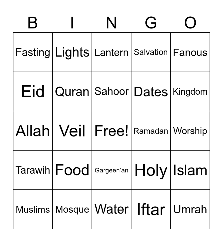 This bingo card has a free space and 24 words: Muslims, Food, Sahoor, Iftar, Fanous, Fasting, Lights, Lantern, Ramadan, Worship, Allah, Quran, Holy, Islam, Eid, Mosque, Water, Salvation, Kingdom, Tarawih, Veil, Gargeen’an, Dates and Umrah.