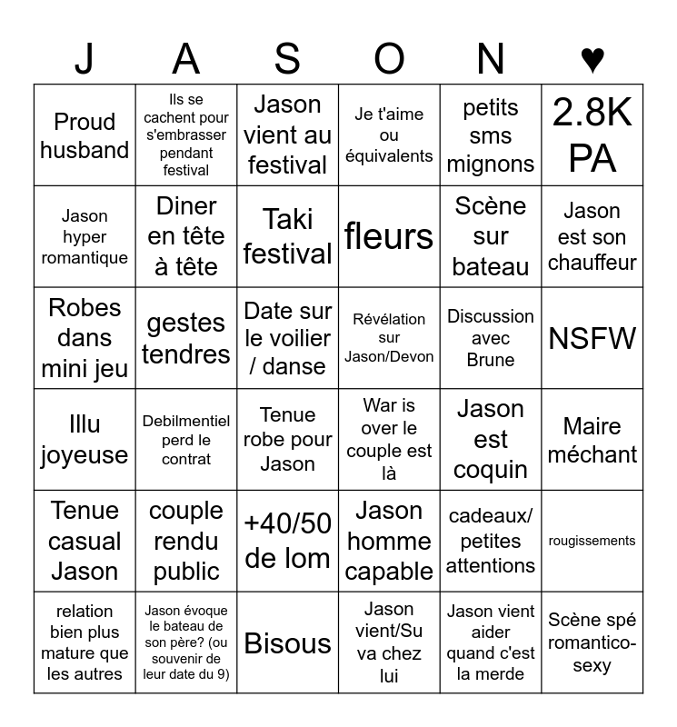 This bingo card has 36 words: Jason homme capable, +40/50 de lom, Jason vient/Su va chez lui, Jason hyper romantique, Illu joyeuse, Révélation sur Jason/Devon, Diner en tête à tête, Bisous, petits sms mignons, cadeaux/ petites attentions, Jason est son chauffeur, Je t'aime ou équivalents, rougissements, gestes tendres, fleurs, Proud husband, Tenue casual Jason, Discussion avec Brune, Robes dans mini jeu, Jason vient au festival, Date sur le voilier / danse, Debilmentiel perd le contrat, War is over le couple est là, Tenue robe pour Jason, Jason est coquin, Ils se cachent pour s'embrasser pendant festival, Scène sur bateau, Jason évoque le bateau de son père? (ou souvenir de leur date du 9), Taki festival, 2.8K PA, Scène spé romantico-sexy, relation bien plus mature que les autres, Maire méchant, NSFW, couple rendu public and Jason vient aider quand c'est la merde.