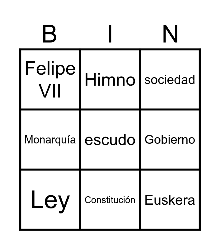 This bingo card has 26 words: Artículos, bandera, Constitución, deberes, escudo, Felipe VII, Gobierno, Himno, iguales, Judicial, Euskera, Legislativo, Madrid, Nacionalidad, obligatoria, Pedro Sánchez, Monarquía, Rey, sociedad, territorio, uniprovinciales, voto, Web, extranjero, Ley and Zarzuela.