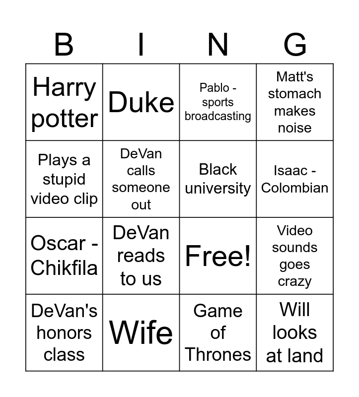 This bingo card has 21 words: Wife, Kids, Duke, Fallout, Game of Thrones, Black university, Harry potter, Pablo - sports broadcasting, Free!, Isaac - Colombian, Oscar - Chikfila, Matt's stomach makes noise, Will looks at land, Gretchen rolls eyes, DeVan calls someone out, Sharp eye contact from DeVan, DeVan's honors class, DeVan reads to us, Plays a stupid video clip, Video sounds goes crazy and DeVan aggressively shakes head yes.