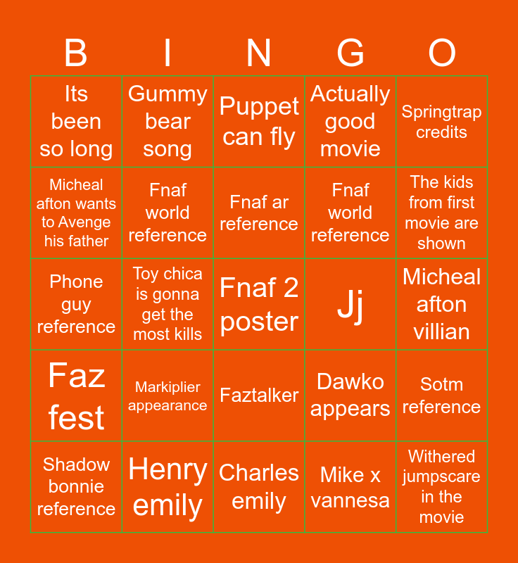 This bingo card has a free space and 24 words: Shadow bonnie reference, Markiplier appearance, Fnaf ar reference, Mike x vannesa, Springtrap credits, Its been so long, Gummy bear song, Puppet can fly, Jj, Micheal afton villian, Phone guy reference, Fnaf world reference, Dawko appears, Sotm reference, Micheal afton wants to Avenge his father, Henry emily, Charles emily, Actually good movie, The kids from first movie are shown, Faz fest, Toy chica is gonna get the most kills, Faztalker, Fnaf world reference and Withered jumpscare in the movie.