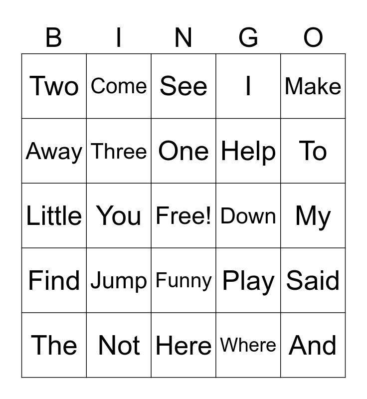 This bingo card has a free space and 24 words: Jump, Not, One, The, Make, Two, Away, Come, Down, Funny, Help, Little, Play, Said, Three, Where, My, See, To, You, And, Find, I and Here.